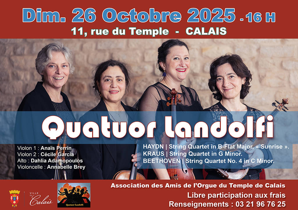Le dimanche 26 octobre 2025, 16h, au temple de Calais, concert du Quatuor Landolfi qui